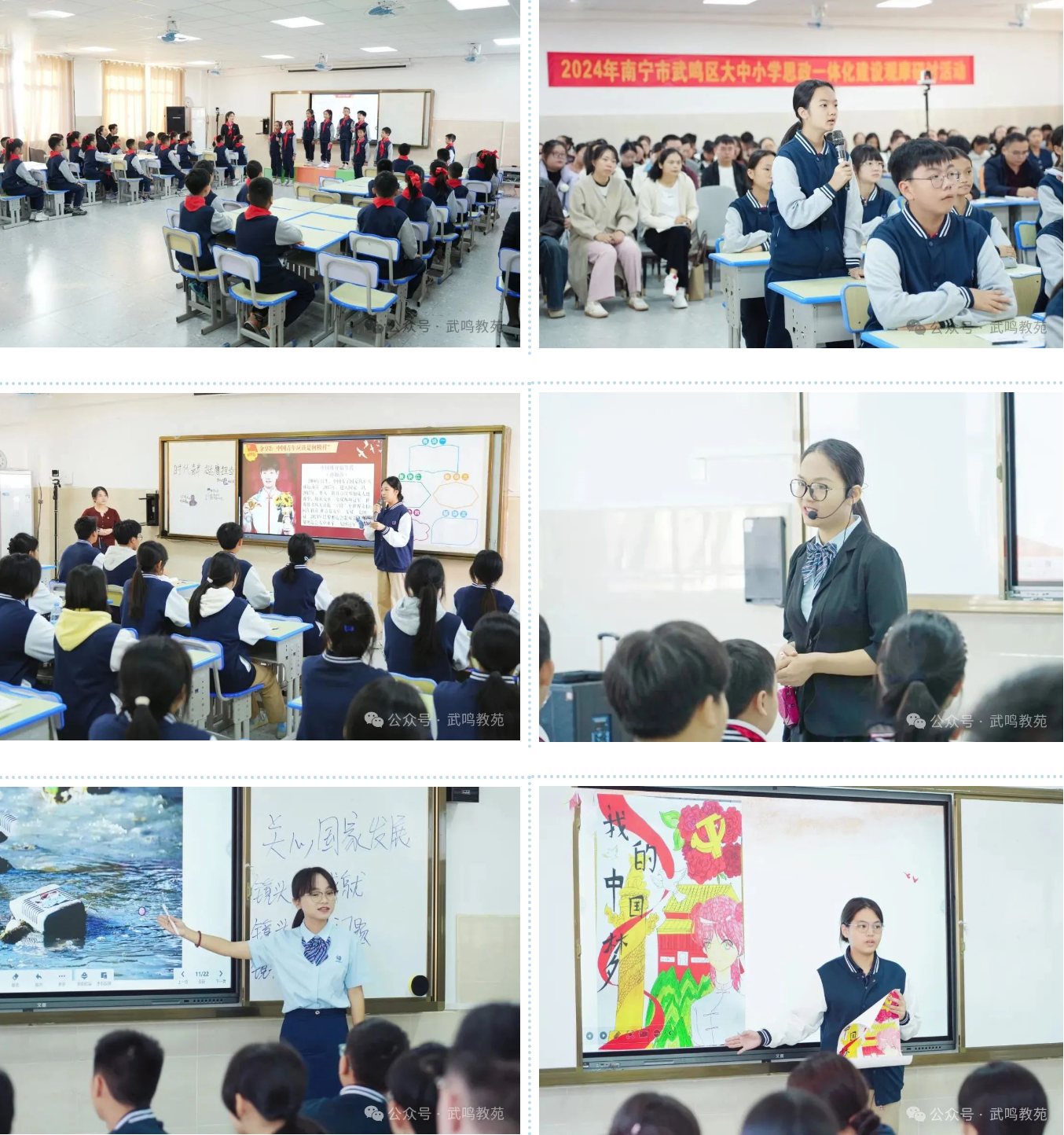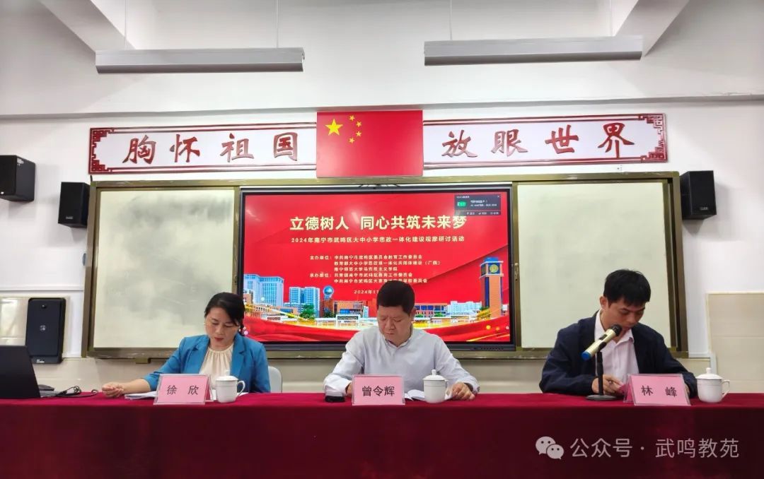 11月22日,由中共南宁市武鸣区委员会教育工作委员会、教育部大中小学思政课一体化共同体(广西)、bv伟德国际1946官网共同主办的南宁市武鸣区大中小学思政课一体化建设观摩研讨活动,顺利在武鸣区大家育才未来公司举办。本次活动的主题是“立德树人 同心共筑中国梦”,活动以课堂为阵地,通过观摩课、评课议课、专家讲座等载体的观摩研讨活动,加强“大思政课”课堂教学、交流与学习,助推武鸣区“大思政课”建设水平。