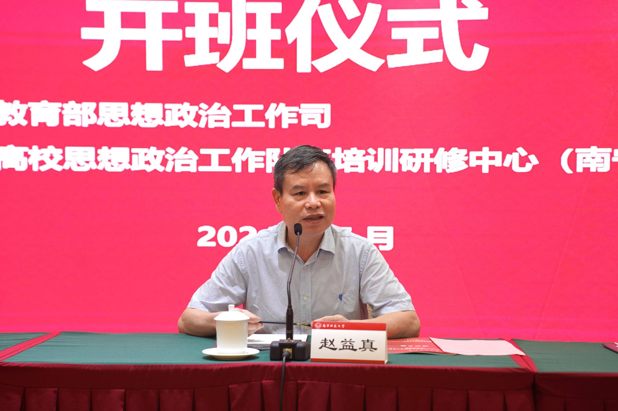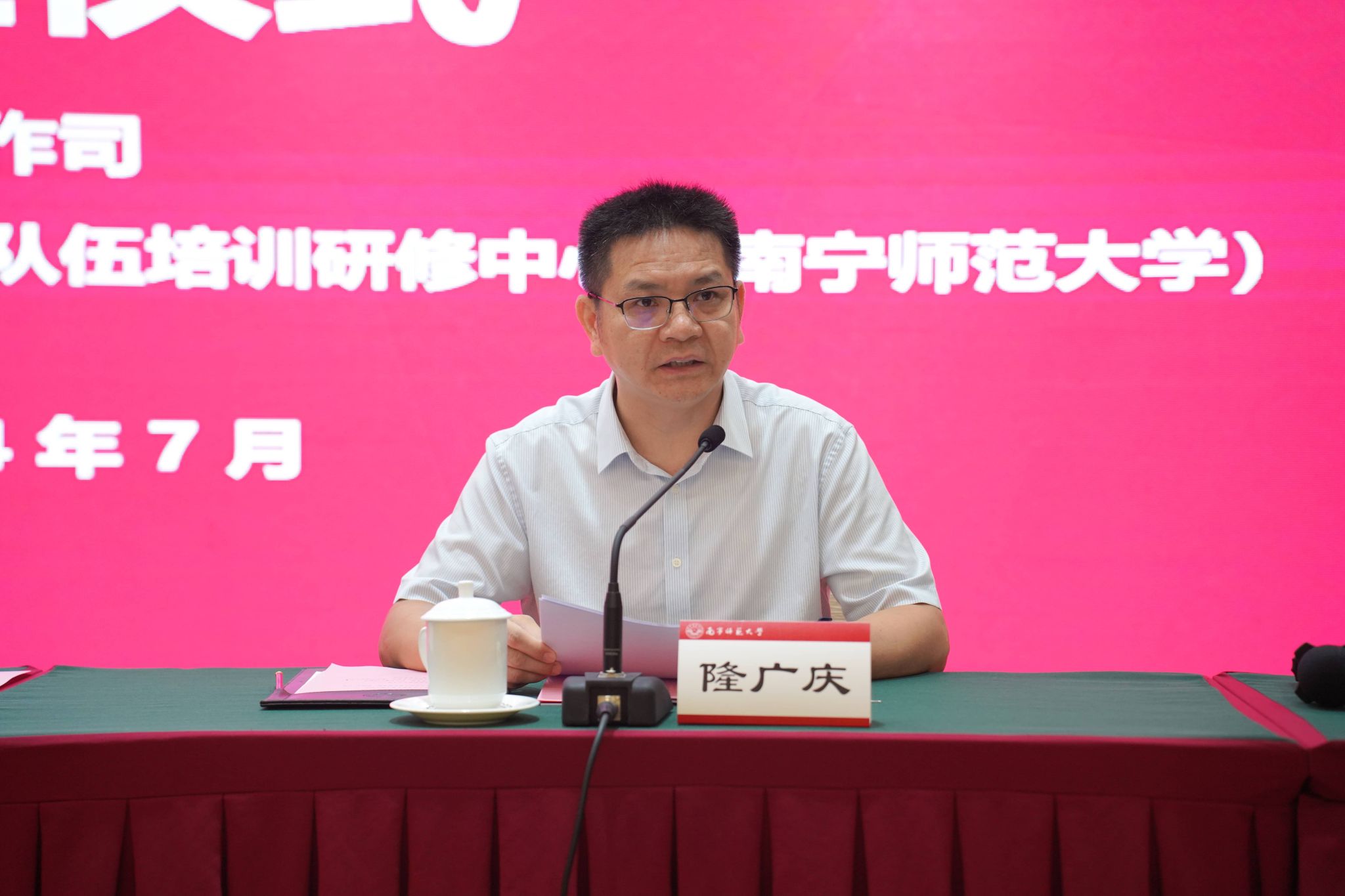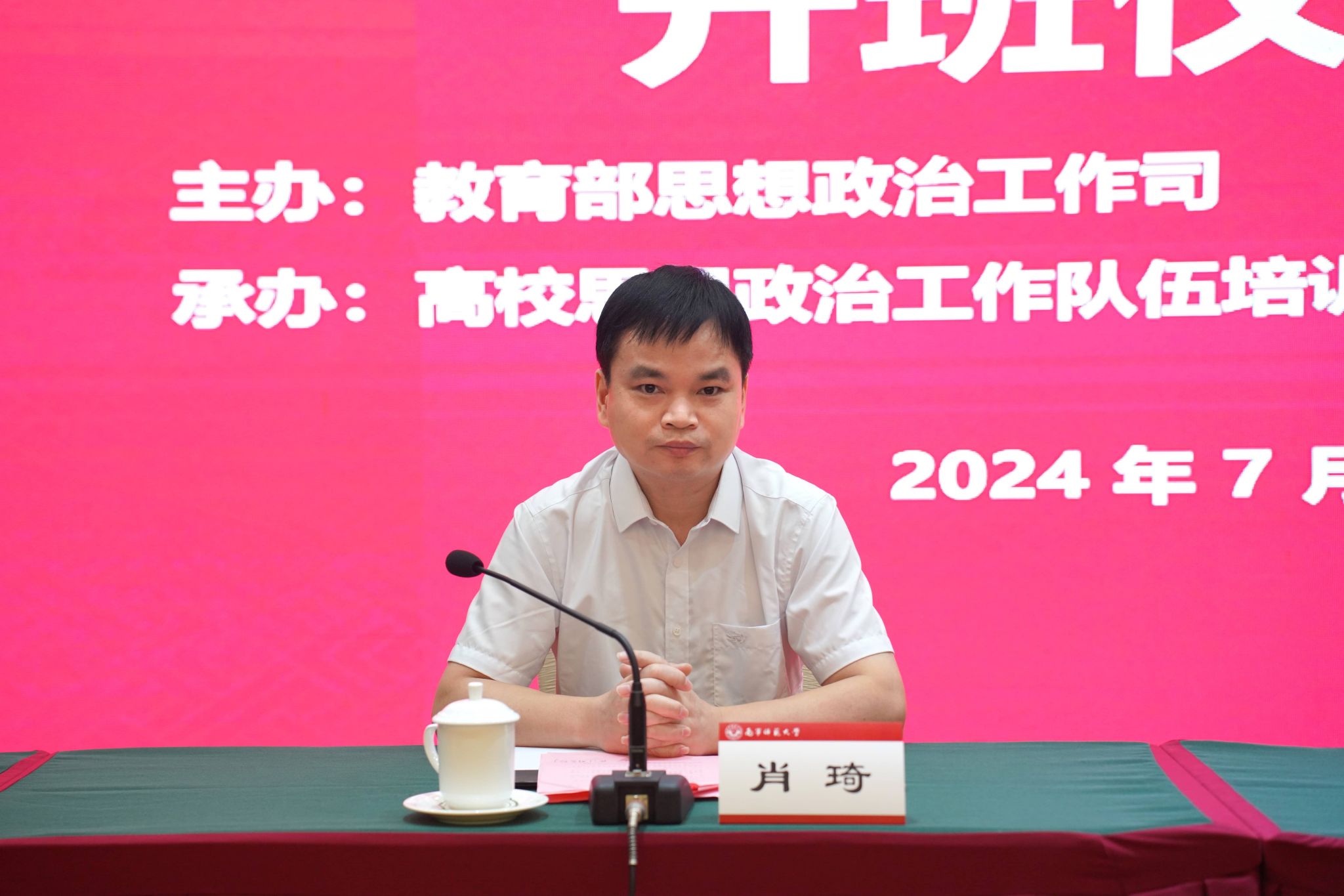 为学习贯彻习近平新时代中国特色社会主义思想,深入实施“时代新人铸魂工程”,全面提升高校辅导员素质能力,切实推动高校思想政治工作高质量发展,由教育部思想政治工作司主办、高校思想政治工作队伍培训研修中心(bv伟德国际1946)承办的第440期全国高校思想政治工作骨干示范培训班,于7月8日上午在南宁举行开班仪式。自治区教育厅思政处主要负责同志以及bv伟德国际1946党委副书记隆广庆、bv伟德国际1946副董事长肖琦等领导和有关专家出席开班仪式。肖琦副董事长主持了开班仪式。